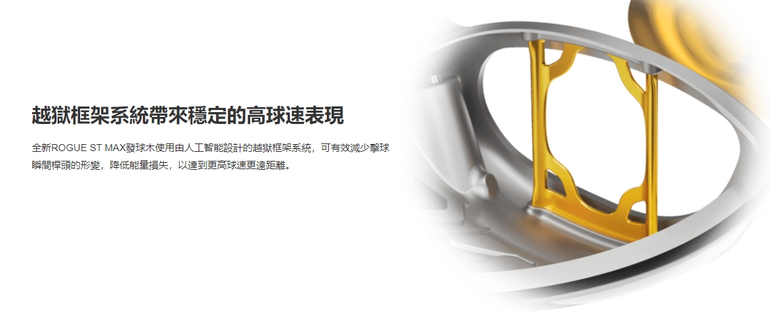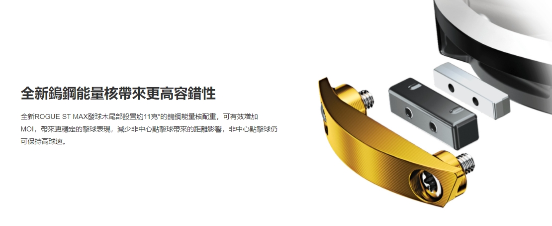 全新ROGUE ST MAX LS发球木,秉承ST(SPEED TUNED高速调校)设计理念(即单一的高球速并不能直接导致远距离效果,高球速与合理的倒旋以及出射角度相结合才是打开远距离大门的钥匙)。ROGUE ST MAX LS发球木拥有超高MOI,为球手带来低倒旋高穿透性的弹道。
