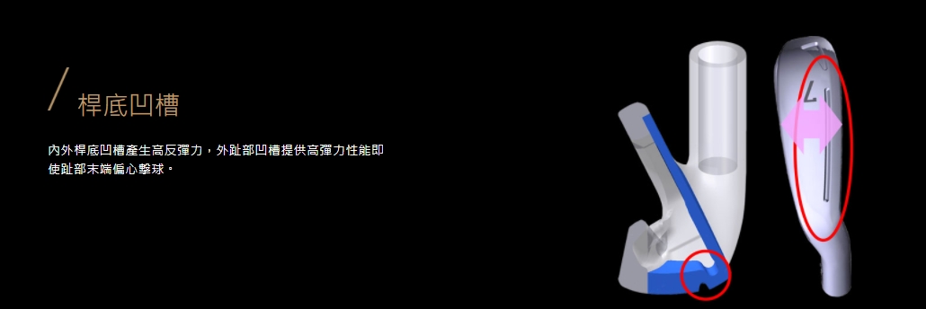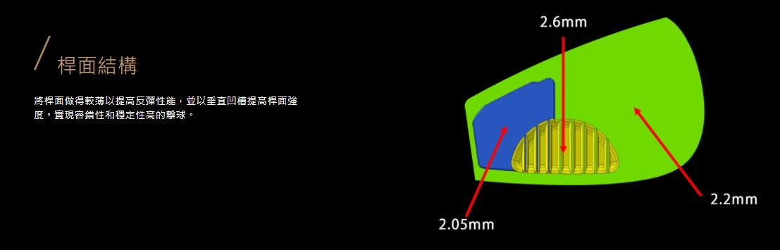 將桿面做得較薄以提高反彈性能,並以垂直凹槽提高桿面強度。實現容錯性和穩定性高的擊球。