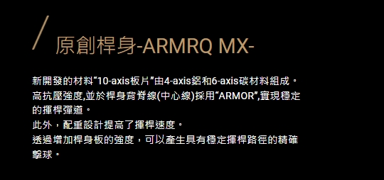 高抗壓強度,並於桿身背脊線(中心線)採用"ARMOR",實現穩定的揮桿彈道。