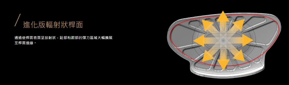 通過使桿面表面呈放射狀,趾部和跟部的彈力區域大幅擴展至桿面邊緣。